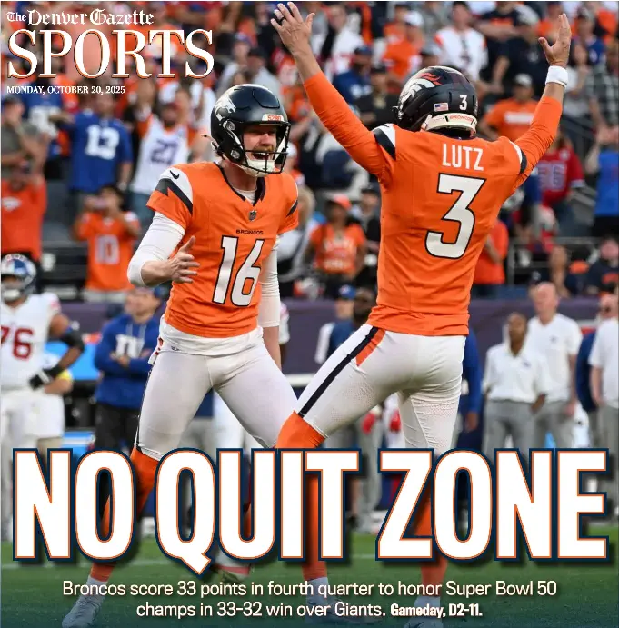 Broncos score 33 points in fourth quarter to honor Super Bowl 50 champs in 33-32 win over Giants.