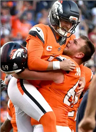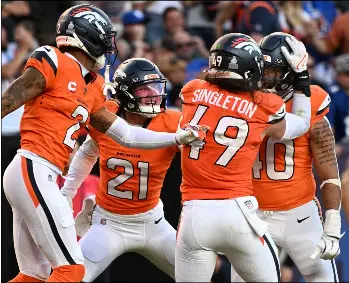 From left, the Broncos’ Pat Surtain II, Riley Moss, Alex Singleton and Justin Strnad celebrate after Strnad intercepted a pass from the Giants on Sunday in Denver. The Broncos’ 33 fourthquarter points were the most by any team that had been shut out in the first three quarters in NFL history.